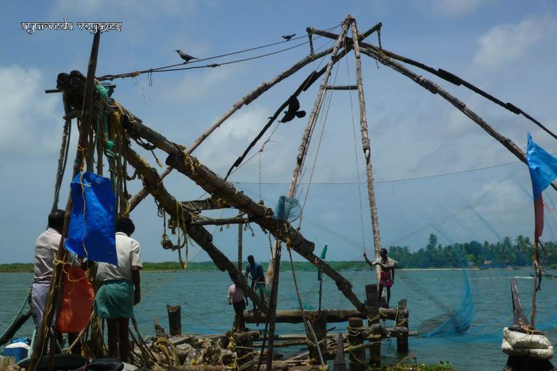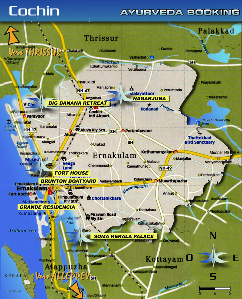 COCHIN et ERNAKULAM, villes voisines, forment une conurbation, mais sont très différentes, tant par leur style de vie que par leur charme : l'une est coloniale, calme, verdoyante, l'autre est moderne, bruyante, polluée et surpeuplée. Pourtant elles se touchent, et il suffit de quelques minutes de bateau pour passer de l'une à l'autre. Y faire une cure ayurvédique n'est a priori pas l'idéal, étant donné la nécessité du calme et d'air pur, c'est pourquoi vous trouverez peu de centres de cures importants à Cochin, par contre, il y a des laboratoires, et bien sûr certains hôtels ont des centres de soins, ou des spas ayurvédiques. On y trouve aussi des hôpitaux traditionnels qui ont été rejoints par la ville, mais qui n'ont pas déménagé. Il s'agit plus là de centres médicaux pour les indiens que des lieux de villégiatures pour occidentaux. Par contre la vieille ville de Cochin est incontournable si l'on doit passer dans la région. Elle vaut vraiment la visite, même si les (quelques) hôtels sont très demandés et proposent des tarifs en conséquence. Il est bon d'y passer au moins deux jours, pour rêver sur une époque révolue, mais aussi goûter au charme d'une ville qui n'a pas encore rattrapé le monde moderne et garde un petit charme colonial très 19ème.