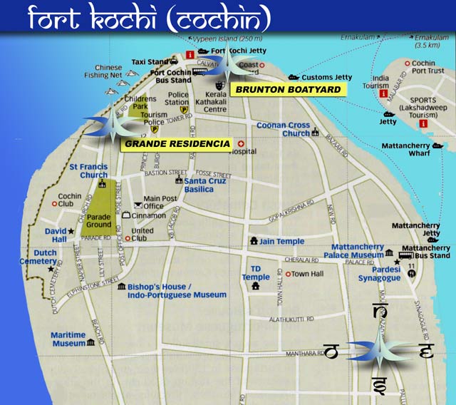 KOCHI (COCHIN) a un aéroport international qui se trouve à trois quarts d'heures de taxi du centre-ville (Ernakulam), une bonne heure de Fort Cochin (la vielle Cochin). TRAIN Il y a aussi une gare ferrovière à ERNAKULAM qui est en liaison avec tout l'Inde. COCHIN est à 218 km de TRIVANDRUM (plus au sud) par la route.